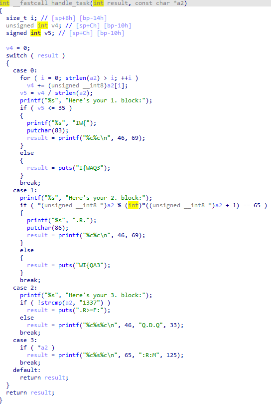case0의 if문을 보면 참일 경우 문자열 "IW{"를 출력하는 것을 볼 수있고, 밑에 putchar(83), printf("%c%c\n", 46, 69);를 봐서는 올바른 구문으로 들어가면 flag에 관한 힌트를 얻을 수 있다.